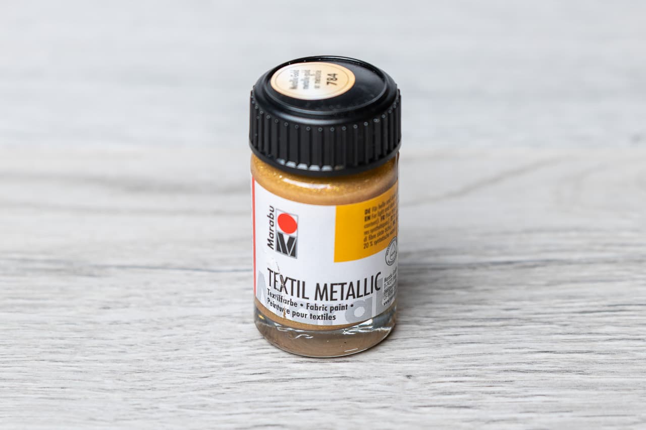 Aby wzór zachował trwałość, utrwal farbę metaliczną po wyschnięciu – w piekarniku (8 min w 150° C) lub żelazkiem (3–5 min od przodu przez cienką ściereczkę, temperatura bawełny). Po utrwaleniu motyw jest światłoodporny i odporny na pranie do 40° C.